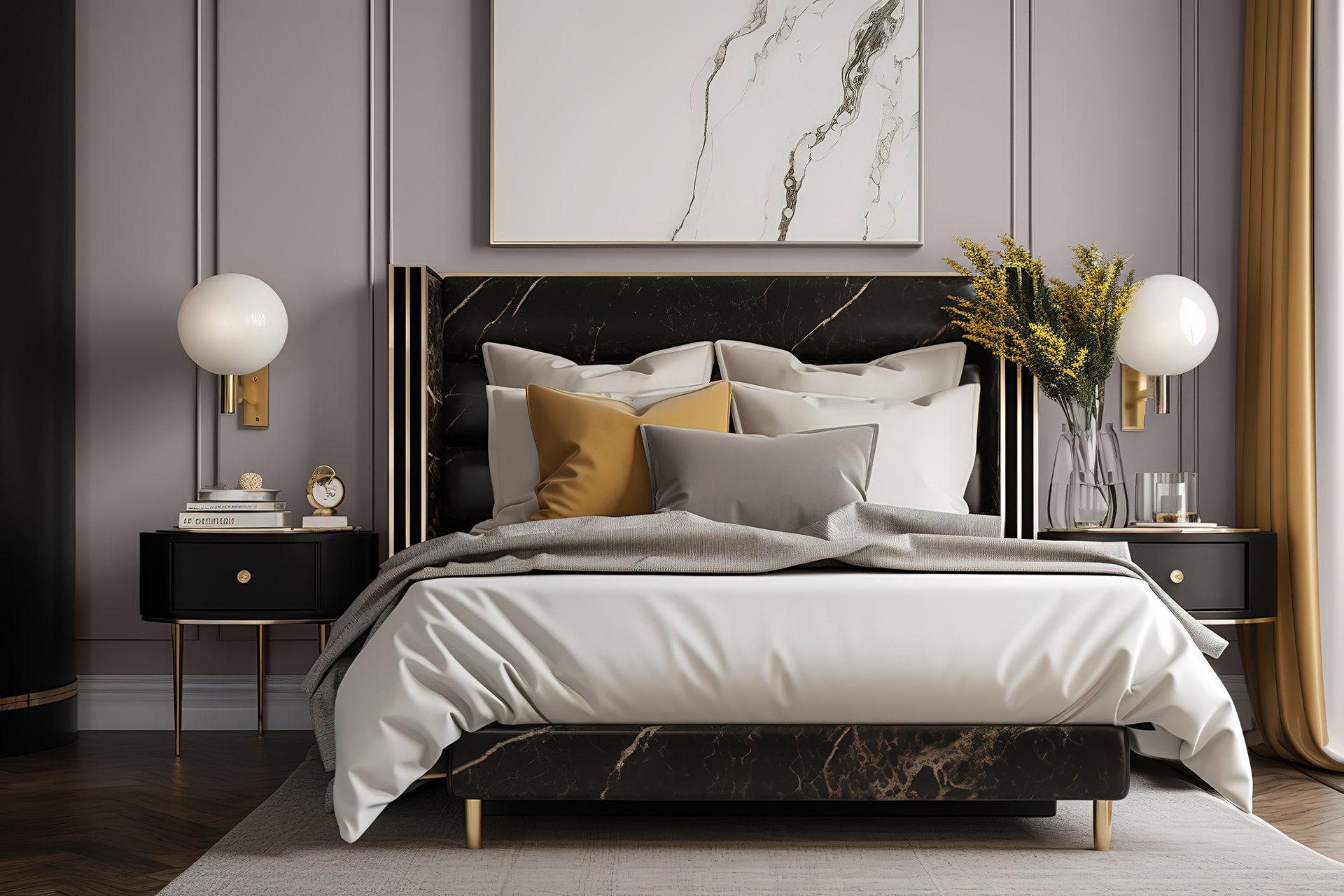 Materiałem, który kojarzy się ze stylem włoskim w domu jest marmur. Zobacz, jak ciekawie wykorzystano ten wzór w aranżacji luksusowej sypialni. Jasna neutralna ściana została tu wykończona sztukaterią i pomalowana na szaro. Taki efekt zyskasz, jeśli użyjesz farby MAGNAT #kolorLove w odcieniu KL14 Jasny Popielaty.