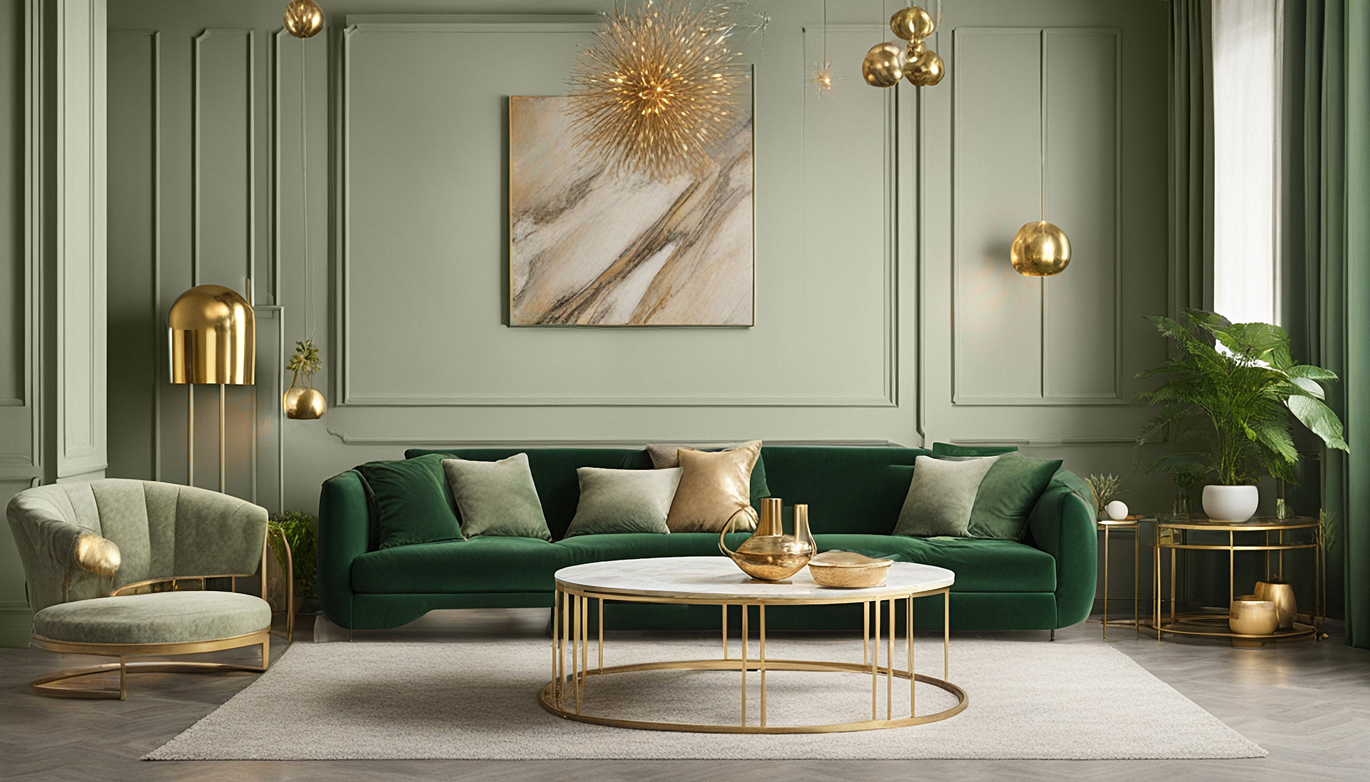 Styl włoski w domu nie zawsze musi oznaczać wyłącznie kolory ziemi. Dobrze sprawdzają się również zgaszone zielenie. W salonie na zdjęciu tłem dla luksusowej sofy w kolorze ciemnej zieleni są oliwkowe ściany. Taki efekt osiągniesz, malując ścianę farbą MAGNAT #kolorLove w odcieniu KL24 Oliwkowy.