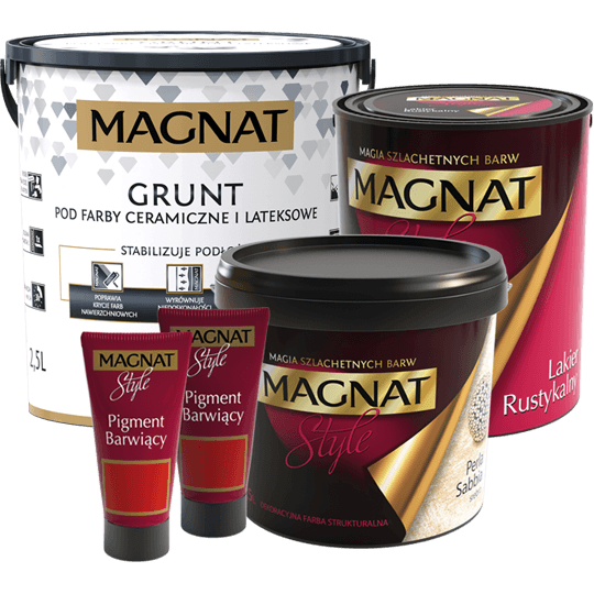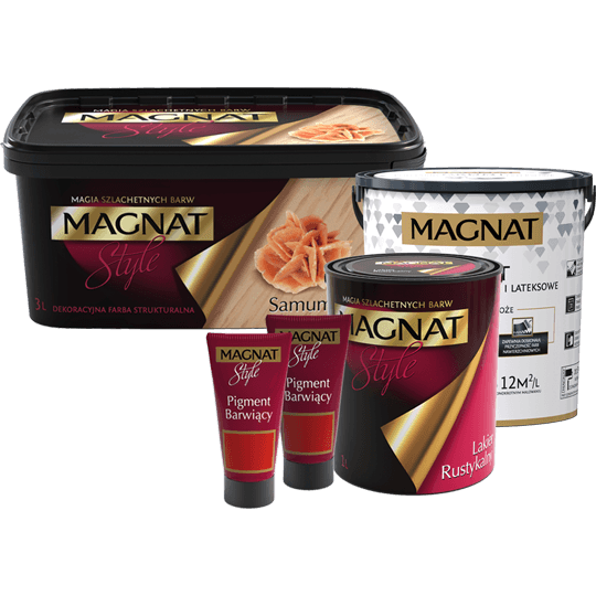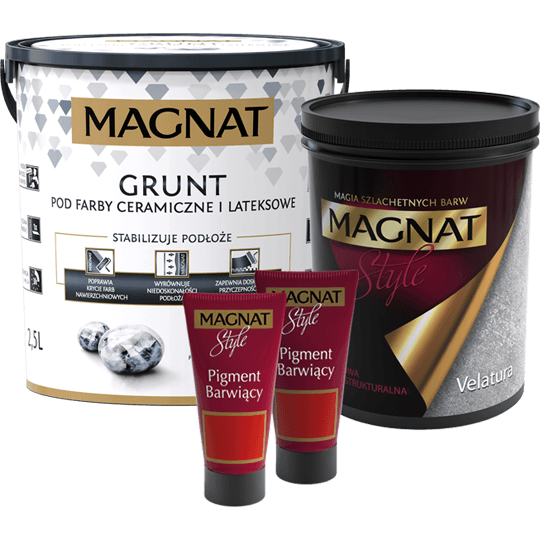 Producent farb MAGNAT doceniając właściwości tego wyjątkowego materiału opracował farbę, która tworzy subtelną, opalizującą światło powłokę przypominającą swą fakturą aksamit. Efekt końcowy zależy od sposobu aplikacji oraz użytych narzędzi – na ścianie powstanie nierównomierna mozaika dwóch odcieni tego samego koloru.