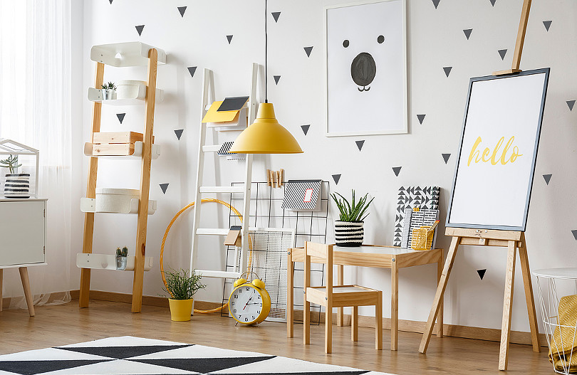 W przypadku pokoju dziecięcego otwierają się jeszcze inne możliwości – użyj kontrastowych barw w części przeznaczonej do zabawy. Za pomocą kilku barw stwórz imitację miasteczka lub uproszczony krajobraz górski.