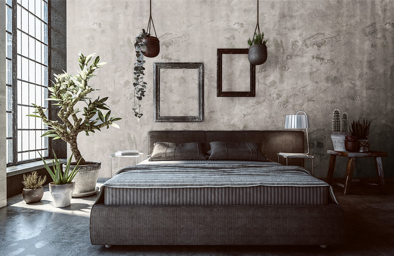 Beton na ścianie za łóżkiem w sypialni - inspiracje
