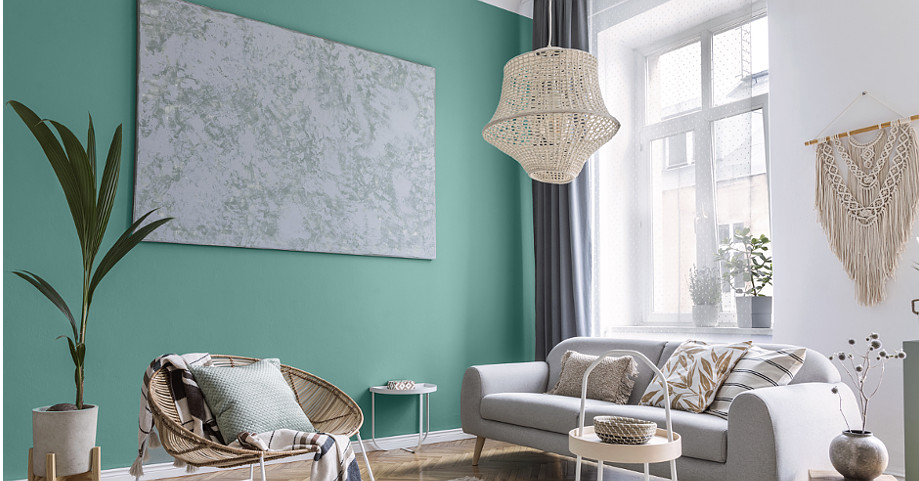 Połączenie pastelowego turkusu, niebieskiego czy zieleni sprawdzi się zwłaszcza w aranżacji boho. W salonie na zdjęciu ściany pomalowano farbą w pięknym kolorze C38 Szmaragdowa Toń z kolekcji Magnat Ceramic. W połączeniu z sofą na smukłych nóżkach i dodatkami scandi boho taka ściana prezentuje się bardzo stylowo.