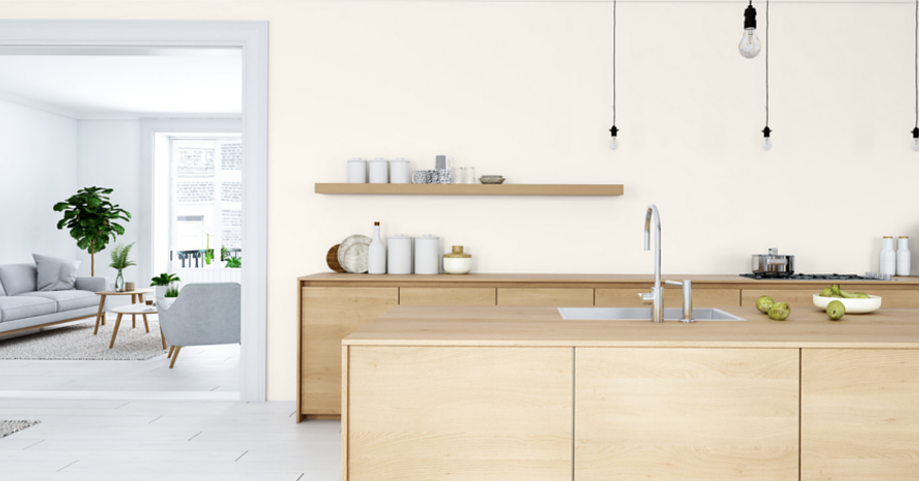 W przypadku jasnych odcieni drewna mebli kuchennych do pomalowania ścian możesz też wybrać kolory ziemi, np. beże, brązy, kość słoniową czy różne tony zieleni.