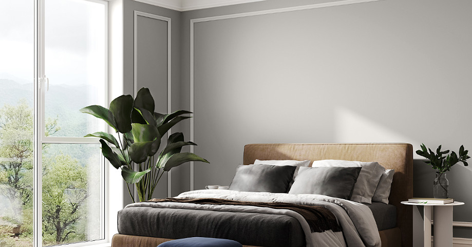 Szara sypialnia ze ścianą za łóżkiem pomalowaną farbą MAGNAT #kolorLove w odcieniu KL17 jasnoszary.