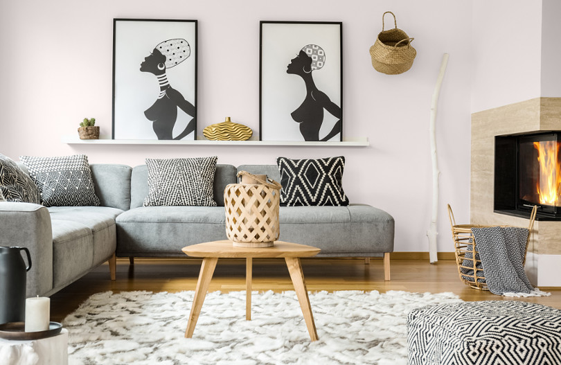 Szary salon w stylu boho. Ściany pomalowane farbą MAGNAT #kolorLove w odcieniu KL14 jasny popielaty.