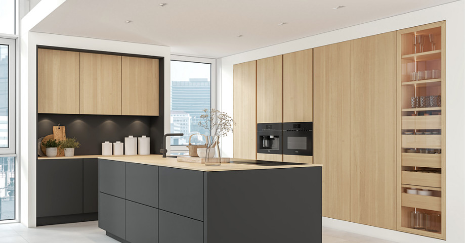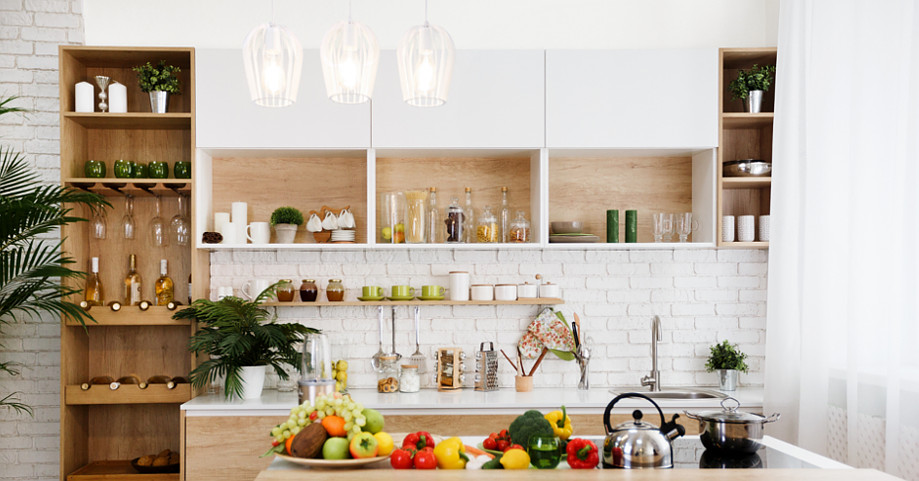 W aranżacji na zdjęciu jasny odcień dębu zestawiono z bielą. Dzięki temu kuchnia prezentuje się jasno, lekko i bardzo przytulnie. Na ścianach i suficie pojawiła się farba Magnat Ceramic Kitchen&Bathroom w kolorze białym (B5 Czysta Biel). To ceramiczna farba, która tworzy powłoki o hydrofobowych właściwościach. Jest odporna na zawilgocenie i kondensację pary wodnej, a przy tym odporna na plamy, ścieranie i środki dezynfekujące.