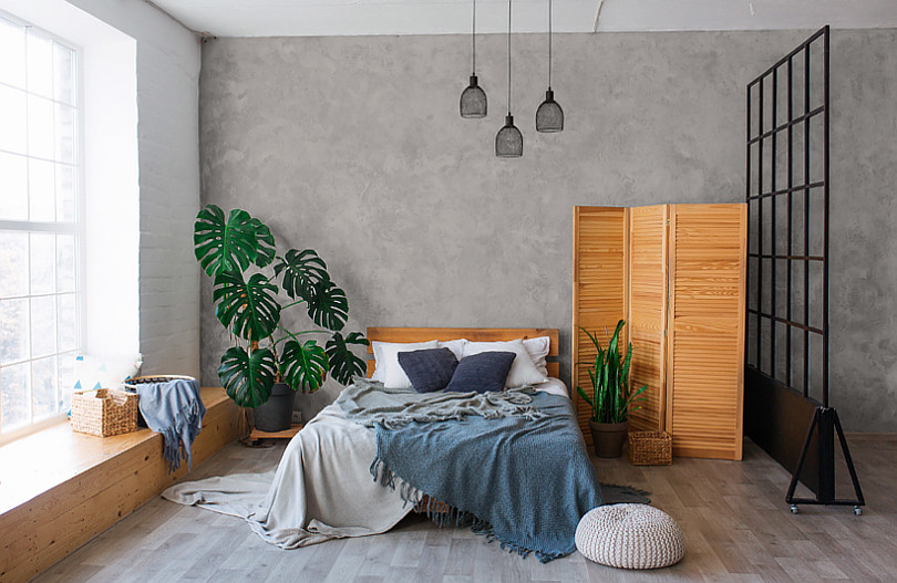 Beton na ścianie za łóżkiem w sypialni - inspiracje