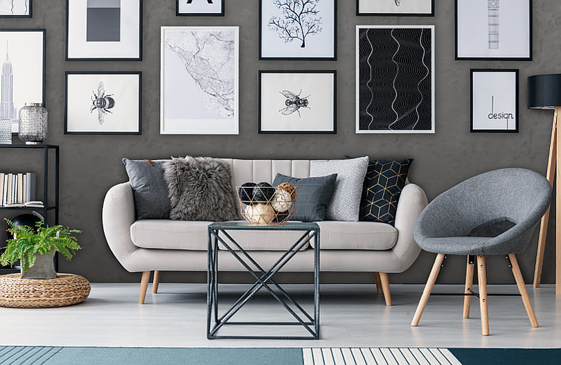 Podobnie prezentuje się ściana w eleganckim salonie na aranżacji, którą zamieściliśmy na zdjęciu poniżej. Tym razem na tle betonowej ściany znalazły się stylowe szare meble, a za efekt wow odpowiada spektakularna galeria ścienna z plakatami, zdjęciami i grafikami.