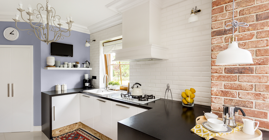 Oryginalnym pomysłem na wyposażenie będzie wstawienie do kuchni kontrastujących, prostych czarnych mebli z białymi, gładkimi frontami, które zrównoważą chropowatą fakturę ceglanych ścian. Stylowy żyrandol i okap ze żłobieniami to ciekawe propozycje tej aranżacji.