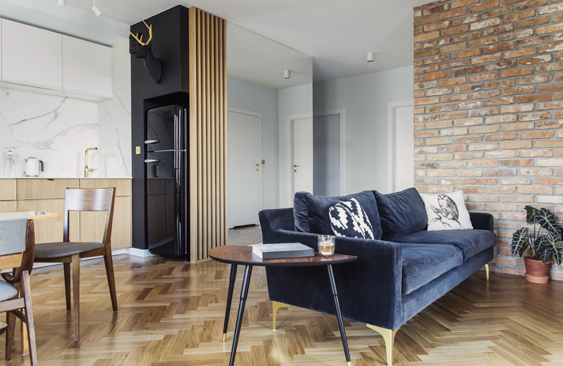 Czerwona cegła w minimalistycznym salonie