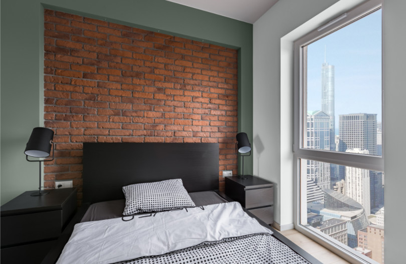 Czerwona cegła i kolory inspirowane naturą w nowoczesnej sypialni