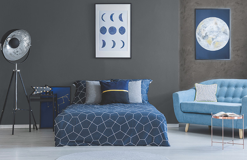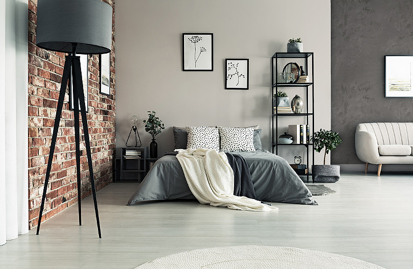 W sypialni możesz również użyć produktów strukturalnych. Zatem oprócz farb sięgnij po wspomniany wcześniej drobnoziarnisty tynk mineralny MAGNAT Style Beton i samodzielnie pokryj nim wybraną powierzchnię. Odpowiednia aplikacja zapewnia dekoracyjny efekt surowego betonu z charakterystycznymi wżerami i ubytkami. Co więcej, powstałe powłoki łatwo się czyści i konserwuje.