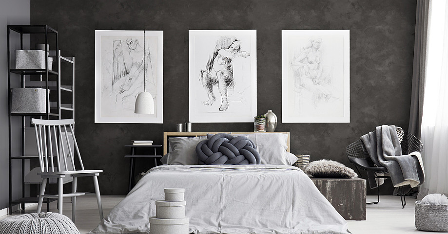Jeśli lubisz różnorodność, możesz swoim ścianom nadać różnorodny charakter, łącząc szarość z naturalną, rudą cegłą. W kwestii wyboru tonacji również nie musisz trzymać się jednego odcienia, a wybrać dwa i np. jedną część ścian pomalować na gładko farbą MAGNAT Ceramic Care A14 Jasny Kalcyt, a resztę pokryć ciemniejszym tynkiem drobnoziarnistym MAGNAT Style Beton Hematyt efekt gładki, który nada ścianie ciekawą fakturę korespondującą z chropowatością cegły. Warto wspomnieć o prozdrowotnych właściwościach pierwszego z wymienionych produktów. Farba MAGNAT Cramic Care oprócz tego, że tworzy trwałe powłoki odporne na plamy zmywanie i szorowanie, dodatkowo oczyszcza bowiem ściany ze szkodliwego formaldehydu. W ten sposób przygotowane powierzchnie są doskonałym punktem wyjścia dla aranżacji w stylu loftowym czy industrialnym, dlatego w pomieszczeniu nie powinno zabraknąć wyposażenia ze stali i drewna oraz palety kolorystycznej utrzymanej w szarościach, kremach i czerni. Natomiast jakie obrazy najlepiej będą się prezentować na szarych ścianach? Sprawdzą się tu minimalistyczne grafiki na białym tle w cienkich czarnych ramach. Zarówno na jasnym i na ciemnym szarym tle stworzą interesujący efekt kontrastu. Co ciekawe, bez problemu część takiej kolekcji możesz również zawiesić na ceglanej ścianie.