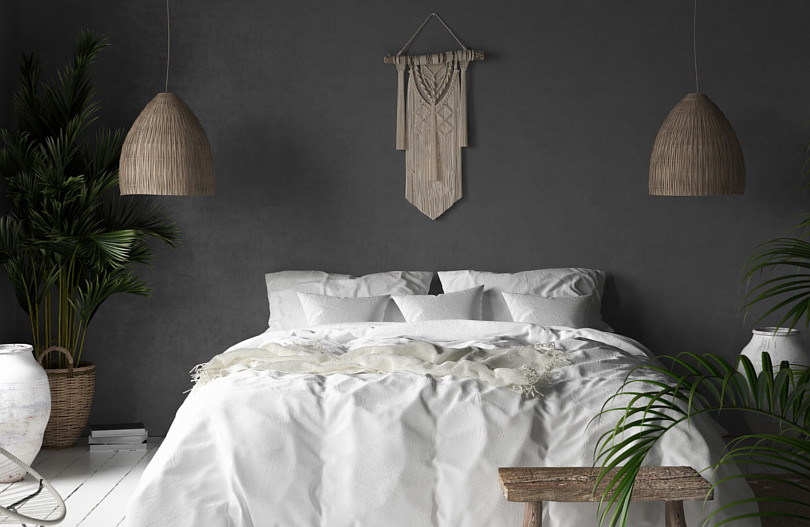 • Ciemne tony jak grafit i czerń – wbrew pozorom czarny i bardzo ciemny kolor dobrze się prezentuje w sypialni i równie dobrze działa na mózg, pomagając wyciszyć emocje. Ważne tylko, aby zadbać o domieszkę czerni i połączyć ją z jaśniejszymi tonami.