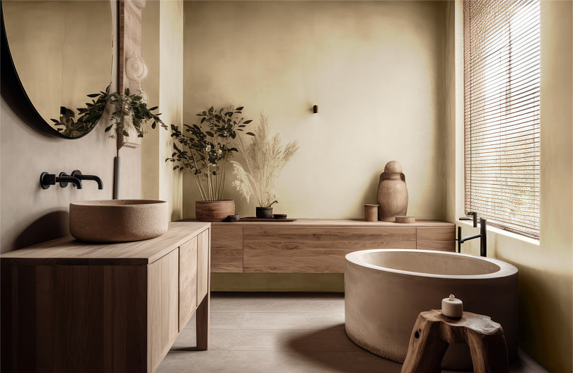Nasza propozycja na łazienkę w stylu japandi to wanna w stylu tradycyjnych japońskich wanien Ofuro oraz drewniane meble łazienkowe i ceramika w kolorach ziemi. Ściany pomaluj jednym z odcieni beżu. Może to być np. B1 Chłodny Kryształ MAGNAT Kuchnia, Łazienka . Zwróć tylko uwagę, aby nie malować powierzchni w bezpośredniej bliskości wody!