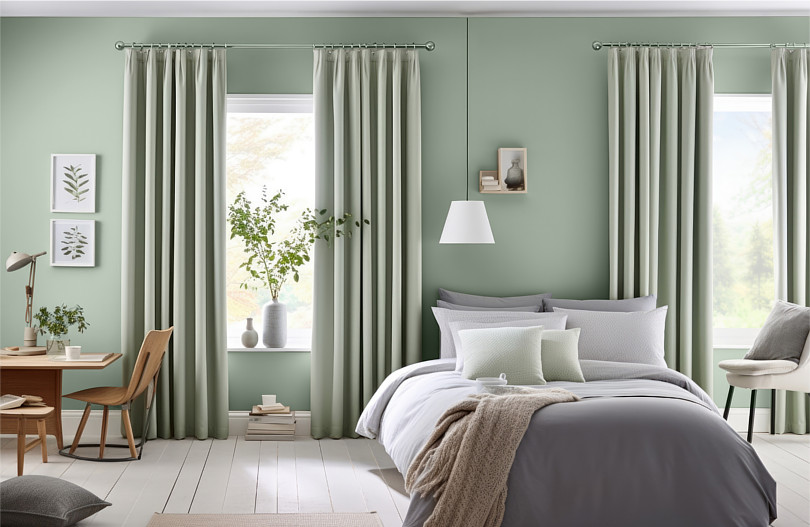 Do sypialni w stylu japandi rekomendujemy chłodne kolory, które pomagają się wyciszyć i wprowadzają atmosferę ukojenia. Mogą to być zimne odcienie mięty, szarości, błękity, a do tego biel i beże.