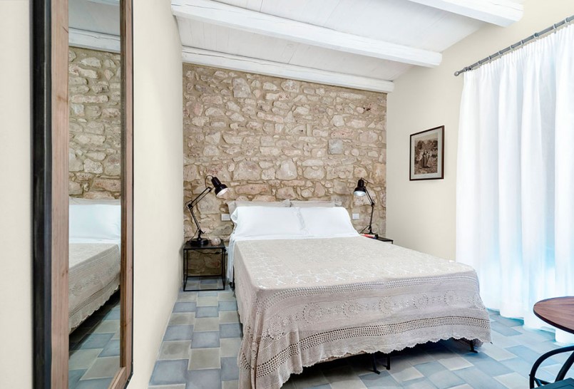 Sypialnia w stylu toskańskim to wnętrze wypełnione ciepłem, w którym panuje przyjemna atmosfera. Jednocześnie emanuje elegancką klasyką, która nigdy nie wychodzi z mody. Kamień na ścianie nad łóżkiem w piaskowym kolorze, sufit pokryty bielonym drewnem z porzecznymi belkami, metalowy karnisz z białą, płócienną zasłoną, biała pościel, beżowa koronkowa narzuta, lustro w drewnianej ramie i metalowe szafki to składniki toskańskiej aranżacji idealnej. Płytki na podłodze w oliwkowo-błękitnych barwach przywołują śródziemnomorskie wille. W takim zestawieniu kolorystycznym doskonale odnajdą się szare ściany pomalowane farbą MAGNAT Creative CR48 Apetyczny Opal.