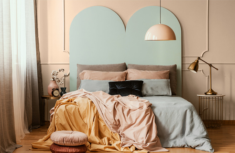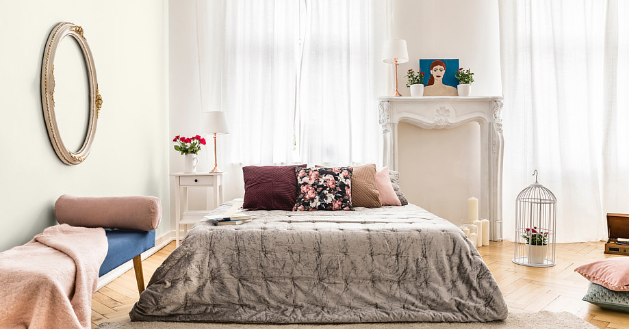 Trójwymiarowości przestrzeni dodasz dzięki pokryciu ścian dwoma kolorami. W naszej aranżacji ścianę z płytką wnęką na łóżko pokryliśmy farbą MAGNAT Ceramic Care A15 Mleczny Chalcedon, natomiast resztę powierzchni pomalowaliśmy produktem MAGNAT Ceramic Care w kolorze A1 Szlachetna Biel.