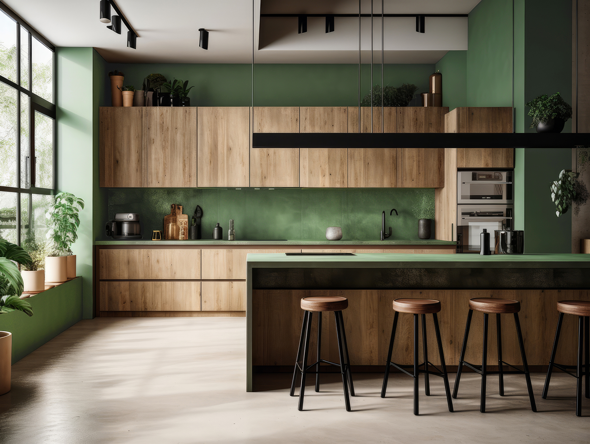 Aby stworzyć takie wnętrze, pomaluj ścianę kolorem khaki lub oliwkowym takim jak np. MAGNAT Ceramic Kuchnia, Łazienka B26 zielony nefryt. Zwróć uwagę, żeby dobrać fronty kuchenne w kolorze drewna , który idealnie pasuje do koloru ścian.