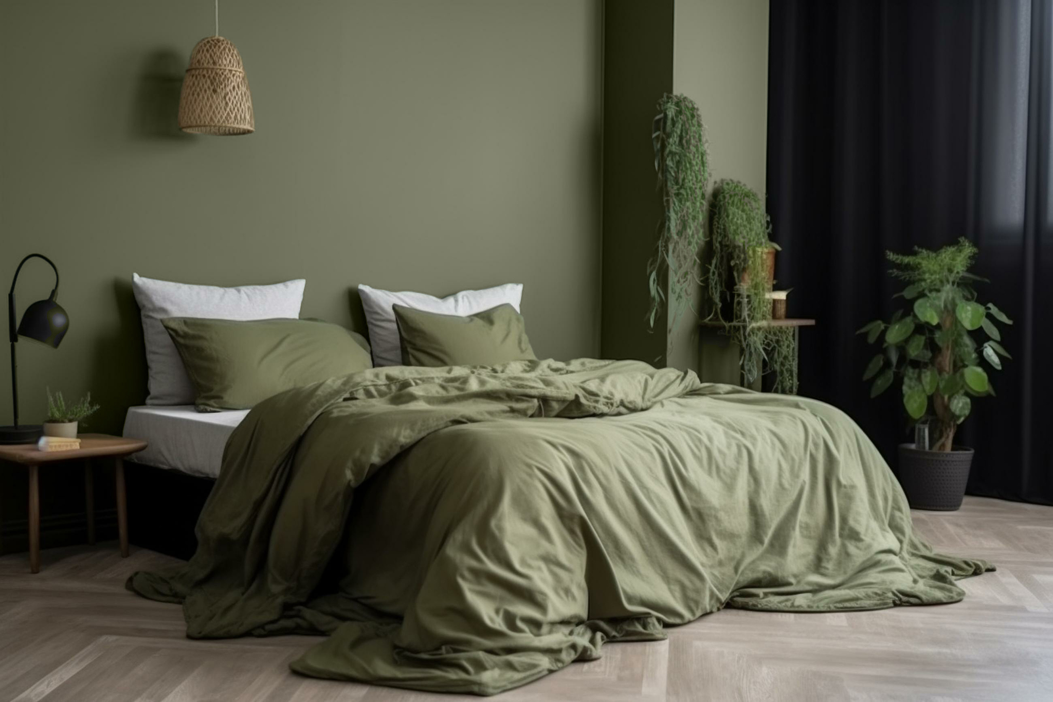 Khaki to kolor doskonały do sypialni, ponieważ wycisza, uspokaja i wprowadza w relaksujący nastrój.