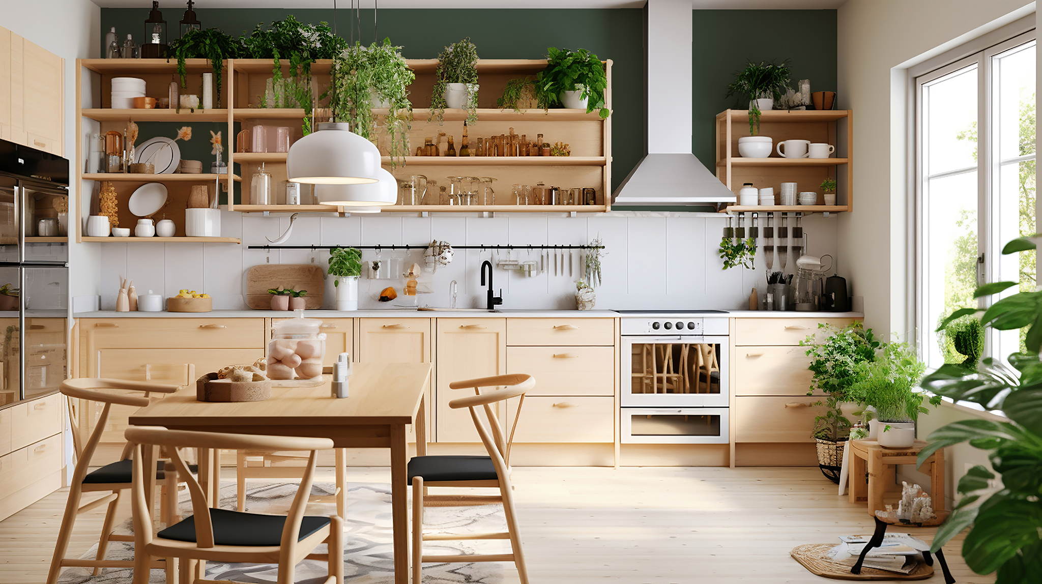 Nasza propozycja to radosna, spokojna i naturalna kuchnia w stylu boho. Aby podkreślić wakacyjny klimat, warto pomalować ściany (lub jedną ze ścian) w kuchni na kolor morski. Może to być np. jego zielony odcień. Znajdziesz taką barwę w kolekcji farb MAGNAT Ceramic Kuchnia, Łazienka, przeznaczonych do pomieszczeń narażonych na wilgoć i parę wodną.