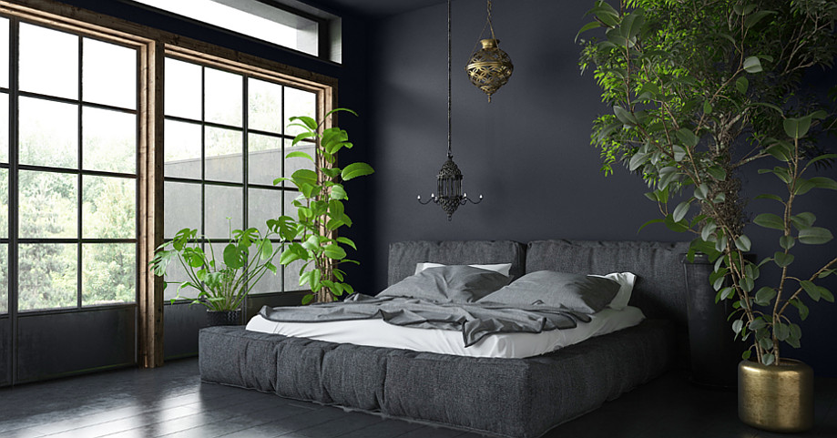 W aranżacji na zdjęciu czarne tapicerowane łóżko stanęło na tle czarnej ściany. Zastosowany kolor to C60 grafitowy antracyt MAGNAT Ceramic.