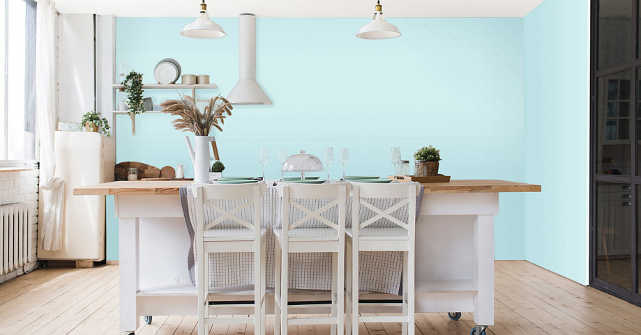 Odcienie wody optycznie powiększają przestrzeń wnętrza. Komponowane są w pomieszczeniu z bielą, stalą nierdzewną i szkłem. Staje się ono za ich sprawą jeszcze bardziej nowoczesne i laboratoryjne. Odcienie te jednak tylko pozornie studzą nasze apetyty. Na tle pastelowych błękitów soczyste odcienie owoców, warzyw i przygotowywanych potraw wydają się być jeszcze bardziej wyraziste i zachęcające do degustacji.