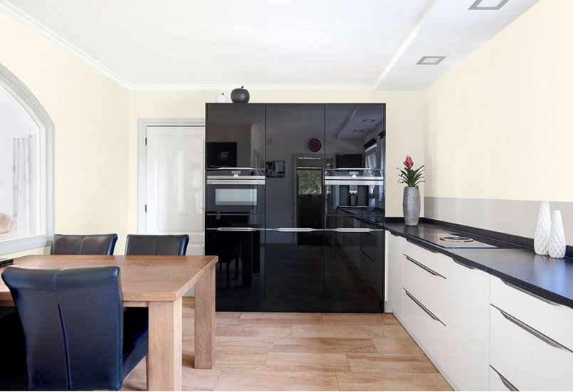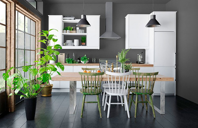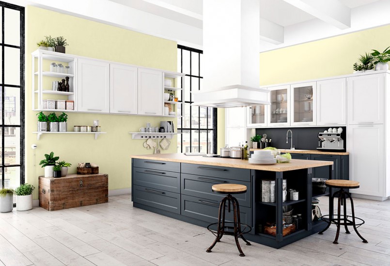 Mając do zagospodarowania dużą powierzchnię, możesz połączyć kuchnię z salonem stawiając wyspę kuchenną skracającą dystans między zabudową kuchenną a meblami w salonie. To interesujące i praktyczne rozwiązanie, które w jednym miejscu pozwala na swobodne przyrządzanie posiłków i wygodne oczekiwanie na moment, gdy będą gotowe. W tej loftowej aranżacji główną ścianę w kuchni pokryto farbą MAGNAT Creative Kitchen Bathroom w głębokim szarym odcieniu KB5 Zamarznięty Piryt. Na jej tle doskonale będzie się prezentować biało-czarna zabudowa kuchenna i czarne elementy wyposażenia jak regały, żyrandol i stołki barowe oraz ciepłe barwy drewna i cegły.