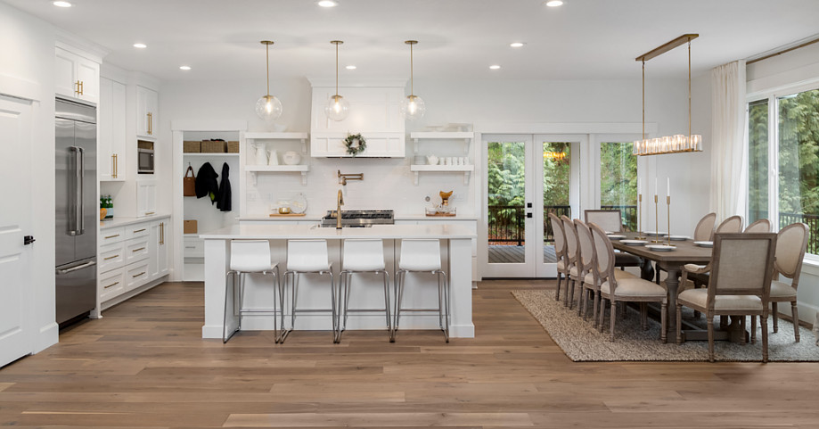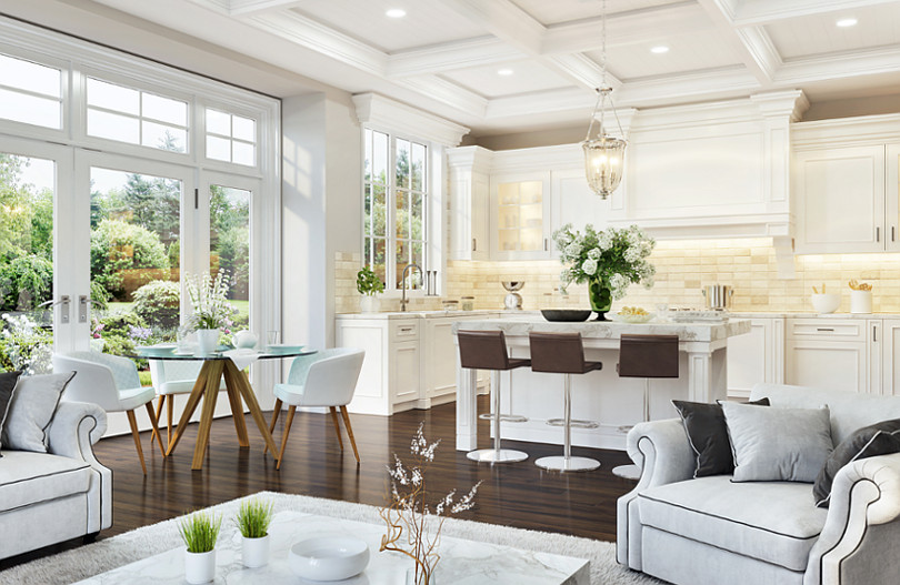Obie strefy pokryj jednolitą ciemną deską z egzotycznego drewna, a ściany pomaluj na biało farbą MAGNAT Ceramic Kitchen&Bathroom B6 Śnieżny Agat. Dekoracyjna biała stolarka okienna ze szprosami w lufcikach oraz klasyczne ozdobne gzymsy, sztukaterie i kasetony na suficie podkreślą wyrafinowany charakter przestrzeni. Podobnie jak biała zabudowa kuchenna z wypukłymi obramowaniami na frontach i podświetlanymi witrynkami oraz blaty np. z białego marmuru. Charakteru doda również biała wyspa kuchenna, przy której nie może zabraknąć wysokich tapicerowanych stołków barowych.