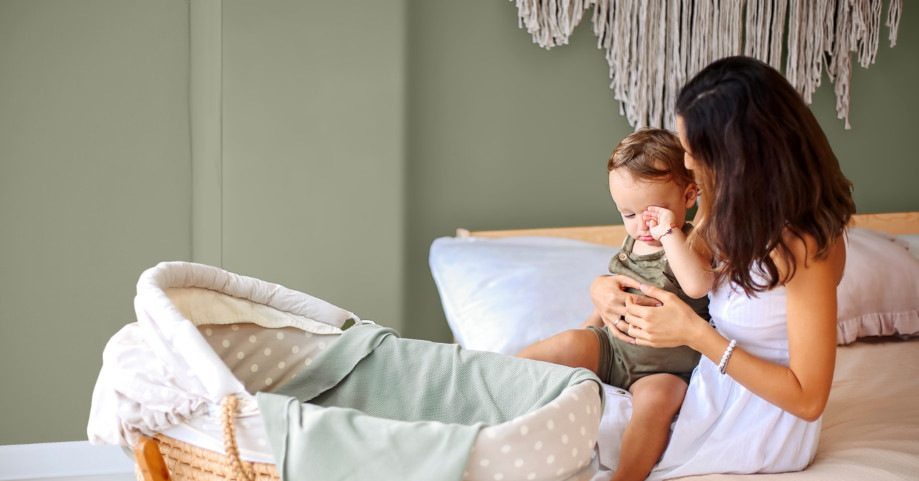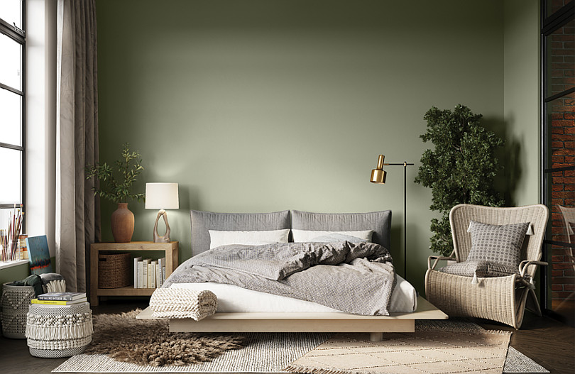 Sypialnia w stylu naturalnym. Ściana pomalowana farbą MAGNAT #kolorLove w odcieniu KL24 oliwkowy.
