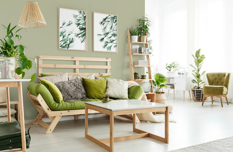 Jak urządzić wnętrze naturalne? Podłogi powinny być wykonane z drewna, a ściany pomalowane farbą w kolorze zaczerpniętym z przyrody (np. KL24 oliwkowy MAGNAT). Unikamy materiałów sztucznych i takich, które generują duży ślad węglowy. Wykorzystujemy meble z odzysku, odnowione własnoręcznie lub kupione na pchlich targach. Kupujemy używane lampy, dekoracje, dodatki. Korzystamy z prac lokalnych rękodzielników i artystów, a nie z sieciowych sklepów. Dywan utkany w niedalekim zakładzie, zasłony uszyte przez krawcową z okolicy, wazon od zaprzyjaźnionej ceramiczki – będzie drożej, ale bliżej naturze!