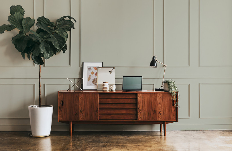 Styl mid-century modern bardzo dobrze współgra z oliwkową zielenią ścian. Na zdjęciu ściana za stylową komodą wykończona sztukaterią i pomalowana farbą MAGNAT #kolorLove w odcieniu KL24 oliwkowy.