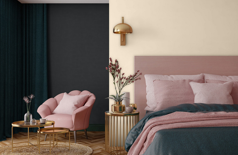 Inna dobra (choć odważniejsza) opcja to zestawienie jasnego i pastelowego koloru łososiowego z ciemnym i nasyconym odcieniem. Może to być grafitowa szarość, głębinowy granat albo bardzo ciemna szmaragdowa zieleń jak w aranżacji na zdjęciu. Sypialnia będzie wyglądać nowocześnie i elegancko.