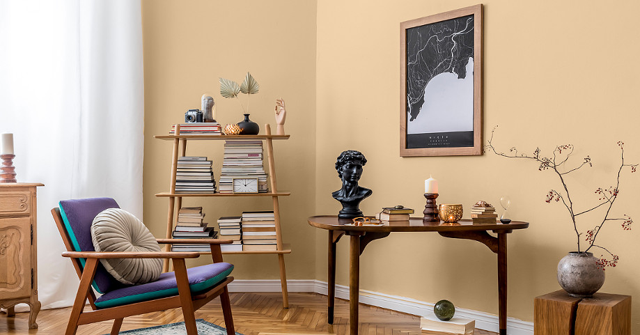 Salon ze ścianą pomalowaną farbą MAGNAT Ceramic w kolorze C25 wyszukany aragonit.