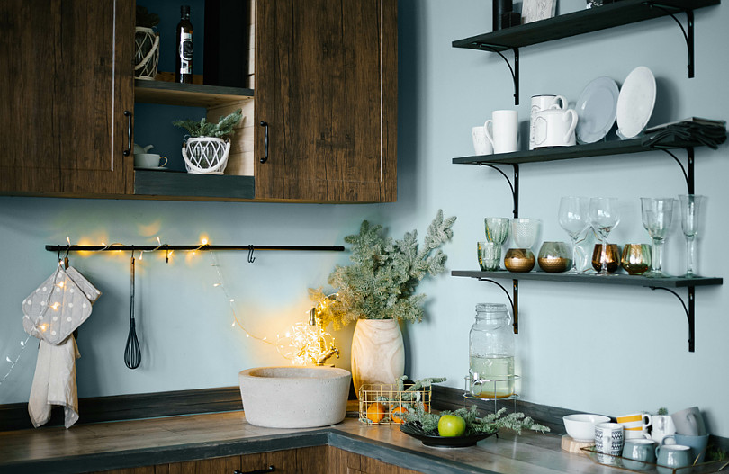 Kuchnia w stylu vintage, boho czy skandynawskim nie musi mieć białych ścian. Równie dobrym pomysłem będzie zastosowanie przeznaczonej do malowania kuchni farby w chłodnym, pastelowym odcieniu. W tej aranżacji ściany w stylowej kuchni wykończono farbą Magnat Ceramic Kitchen&Bathroom w kolorze B17 Morski Akwamaryn. Jasny, piękny odcień, łączący tony niebieskie i zielone, sprawi, że wnętrze będzie wydawać się świeże i powiększy je optycznie.