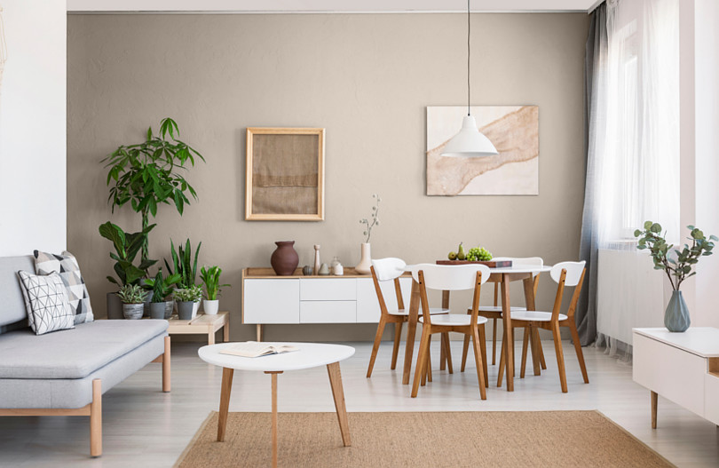 Pierwsza propozycja to salon z jadalnią, zaaranżowany w jasnych kolorach i w prostym stylu inspirowanym Skandynawią. Znalazła się tu więc szara sofa, a wszystkie meble dobrano tak, by jasne drewno łączyło się w nich z czystą bielą. Stół w jadalni jest niewielki. Ma biały blat i drewniane nogi. Pasują do niego krzesła z lakierowanymi na biało oparciami. W naturalnym, przytulnym wnętrzu wyróżnia się ściana pomalowana na kolor ziemi – to odcień KL19 beżowy MAGNAT #kolorLove.