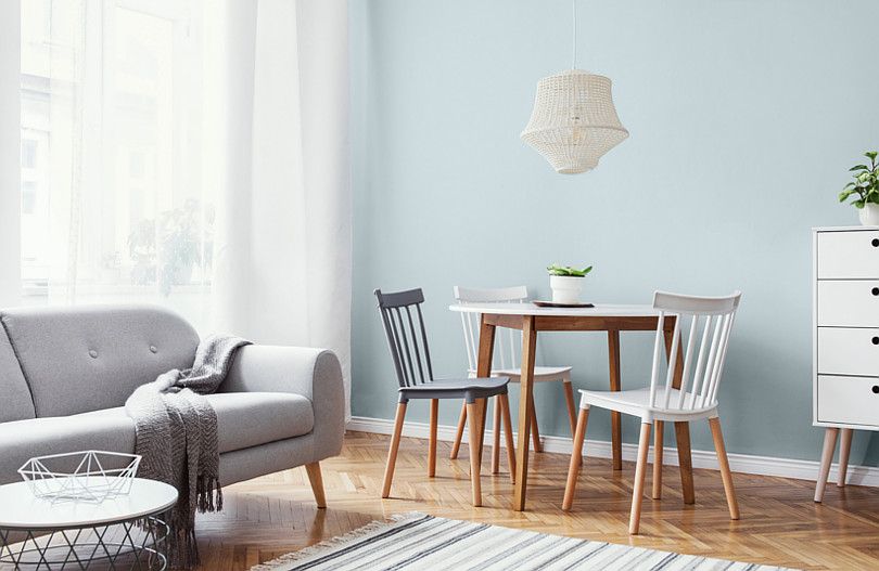 Mała jadalnia w skandynawskim stylu. Ściana pomalowana farbą MAGNAT #kolorLove w odcieniu KL28 błękitny.