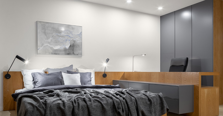 Zauważ, jak pościel w szarym kolorze, która wyróżnia strefę spania, idealnie harmonizuje z szarym wykończeniem mebli zasilających przestrzeń biurową. Tę chłodną szarość, biel ścian i czerń dodatków ogrzejesz wizualnie, jeśli wybierzesz ciepłe wybarwienie drewna mebli.