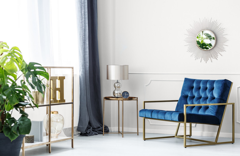 Szarość zestaw z wyposażeniem wykonanym z pozłacanej stali. Proste regały, stoliki oraz pikowana sofa tapicerowana granatowym pluszem wystarczą. Do tkaniny obiciowej mebla pasuje również granatowa donica oraz piękny stylowy pozłacany budzik z granatową tarczą. Aranżację dopełnij pozłacanymi i posrebrzanymi dekoracjami. Na ścianie zawieś piękne lustro oprawione w złotą ramę udającą słońce, a w rogu pokoju ustaw gustowną szklaną lampę z połyskującym abażurem. Pięknym uzupełnieniem tego wystroju będą białe gładkie firany i długie zasłony w stalowym kolorze.