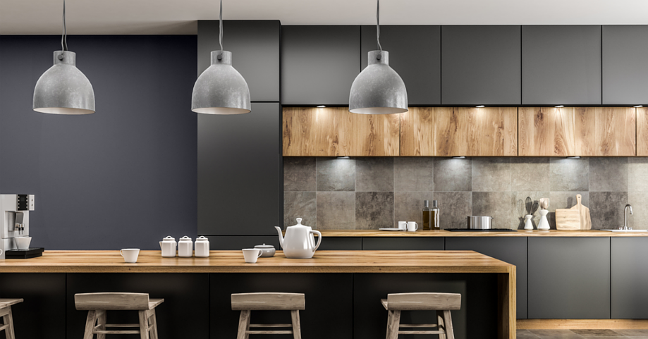 Ważnym elementem w tej aranżacji jest odpowiednie umiejscowienie źródeł światła. Jak widzisz, proste, stalowe lampy nad stołem i punktowe oświetlenie w strefie roboczej sprawiają, że mimo dużego udziału ciemnych szarości w tym projekcie, kuchnia wcale nie wygląda ponuro.