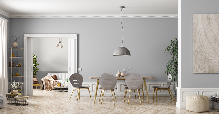 Chcąc podkreślić elegancki charakter barwy, możesz wprowadzić stylowy element dekoracyjny ściany, jak białe lamperie czy ozdobne listwy ścienne i podłogowe.