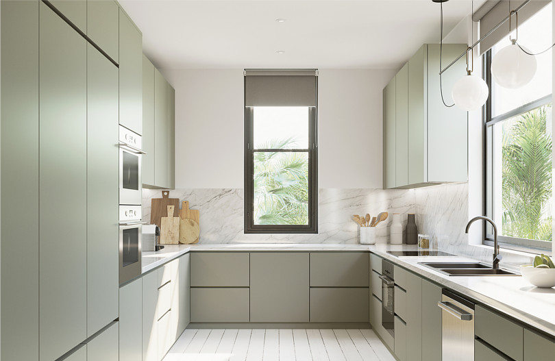 W kuchni na zdjęciu meble kuchenne w kolorze pistacjowym mają prostą, minimalistyczną formę. Aranżację rozjaśnia biały blat i pomalowane na biało ściany kuchenne. Możesz użyć farby MAGNAT Ceramic Kuchnia, Łazienka w kolorze B5 Czysta Biel lub B21 Biały Kamień.