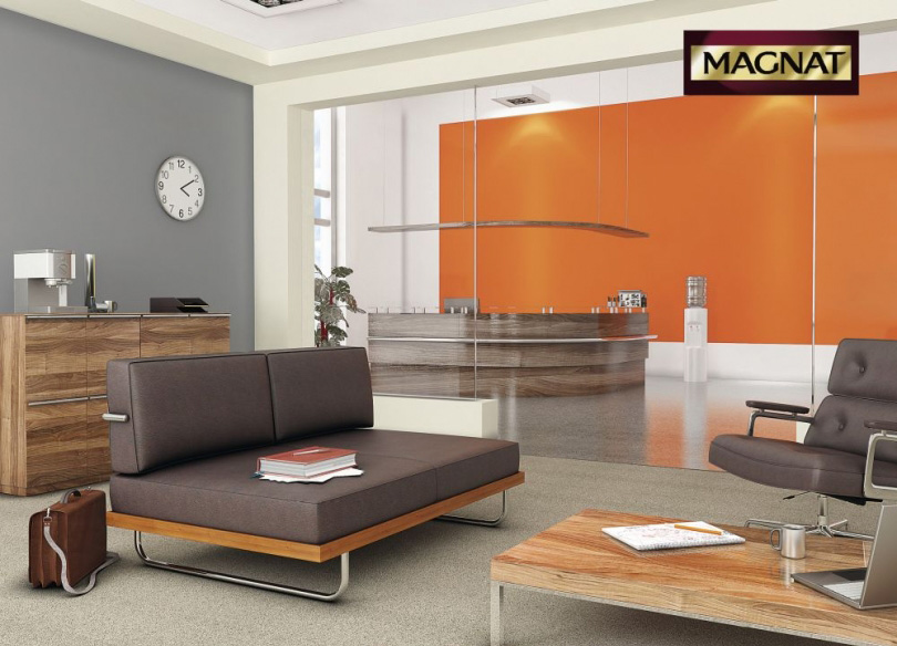 Wspierają starania dążące do osiągnięcia sukcesu w pracy, uzyskania uznania, dobrej reputacji i sławy. Dlatego dobrym pomysłem będzie zastosowanie kolorów ognia, czyli czerwieni, purpury i mocnych odcieni żółtego oraz pomarańczowego wszędzie tam, gdzie zależy nam na osiąganiu sukcesów. Te kolory pobudzają też kreatywność i korzystnie wpływają na relacje międzyludzkie. Dlatego sprawdzą się szczególnie dobrze w gabinecie dyrektora artystycznego, pokoju grafików, copywriterów, czy też na sali, w której odbywają się burze mózgów. W zaprezentowanej aranżacji użyliśmy połączenia kolorów MAGNAT Ceramic C20 Tygrysie Oko, C31 Grafitowy Marmur oraz C1 Biały Diament.