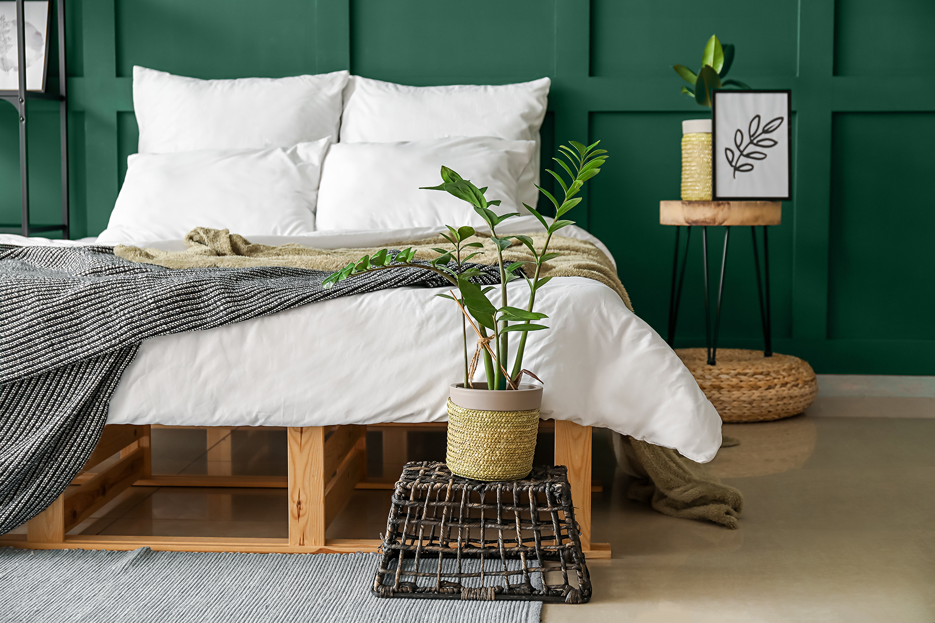 Odpowiednie kolory do sypialni to relaksujące i uspokajające barwy natury — zwłaszcza zielenie. Warto zestawić je z bielą, która działa na nas kojąco i daje uczucie czystości. Polecany kolor ścian z palety MAGNAT to np. C80 Ciemnozielony Malachit MAGNAT Ceramic.