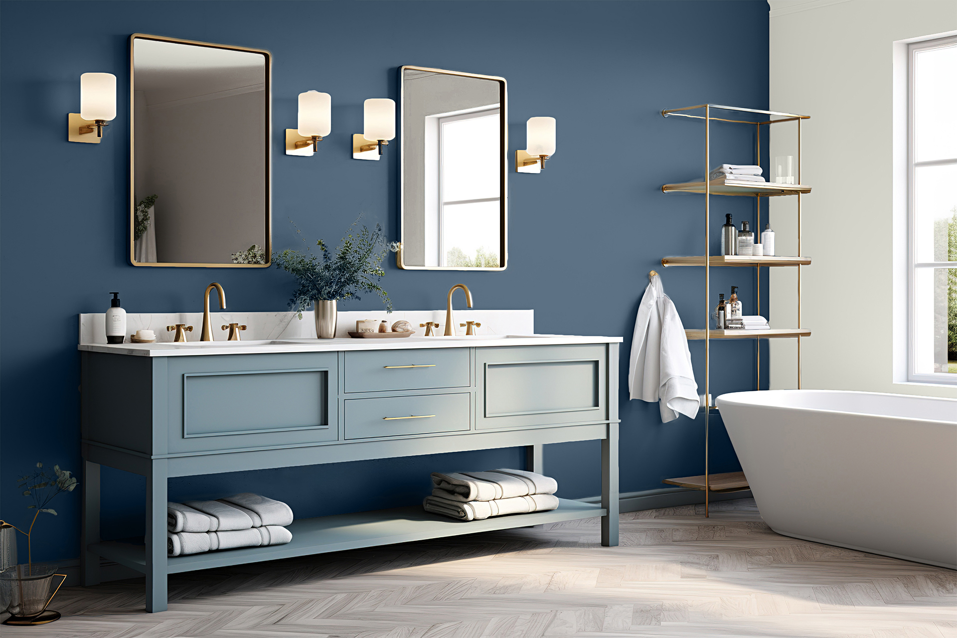 Łazienka to przestrzeń kojarząca się z wodą. Naturalną kolorystyką tego wnętrza są więc różne odcienie niebieskiego, od błękitu po stonowany granat. Aby wprowadzić marynistyczny klimat, możesz pomalować jedną ze ścian na kolor granatowy (B25 Granatowy Agat MAGNAT Ceramic Kuchnia, Łazienka), a pozostałe na biało (B5 Czysta Biel).