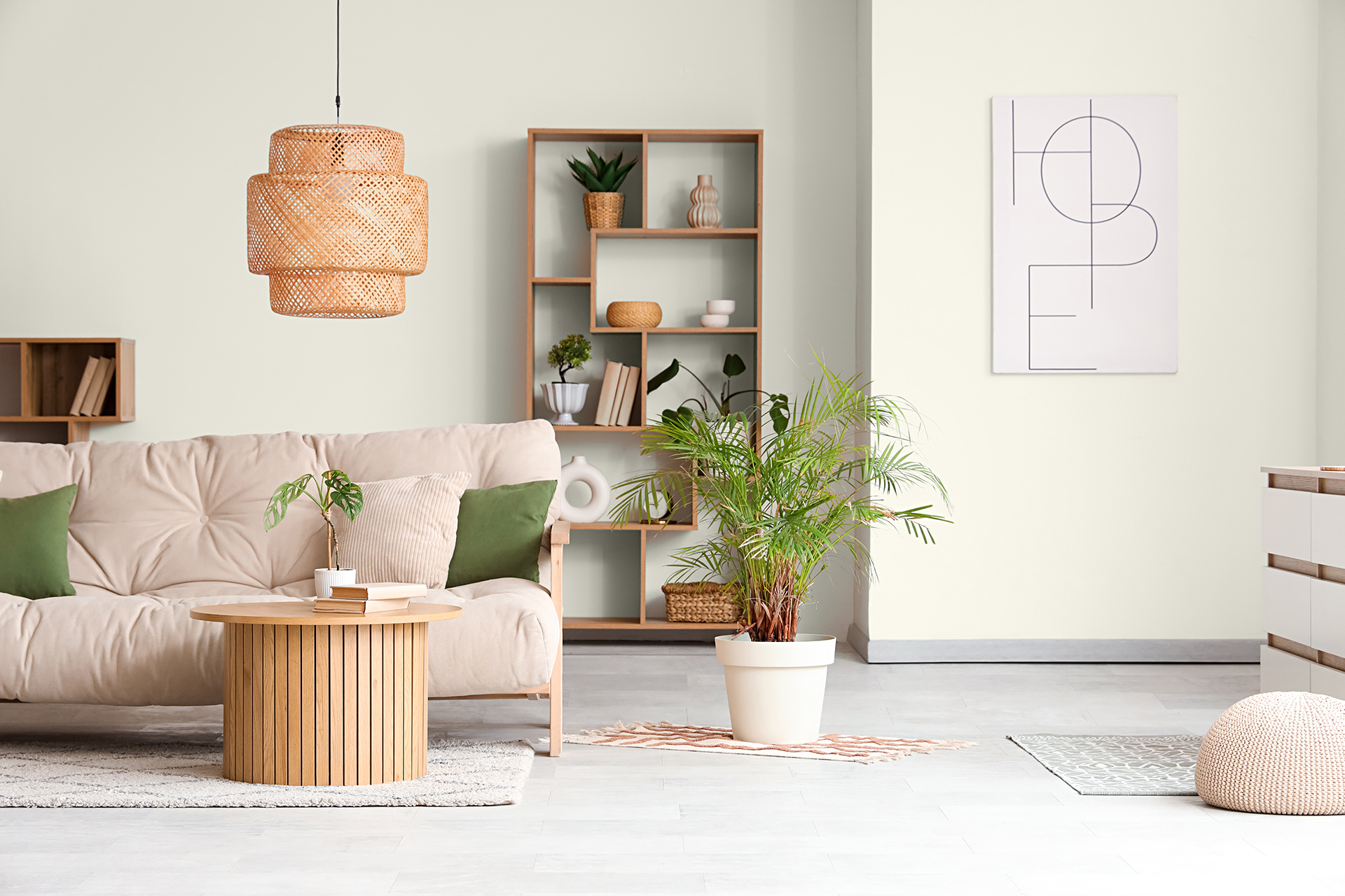 Dodatki? Polecamy wiklinę i rattan np. pod postacią koszy na koce, lamp z plecionki, a nawet foteli. Ceramika to kolejny must-have — w przytulnym salonie w stylu skandynawskim sprawdzą się matowe doniczki, ręcznie robione misy, kubki o organicznych kształtach.