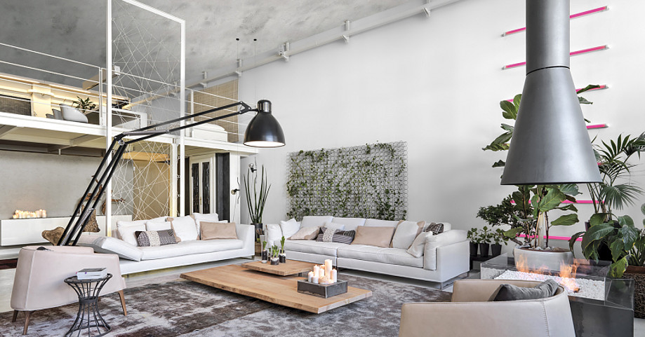 Oryginalna aranżacja salonu z kominkiem