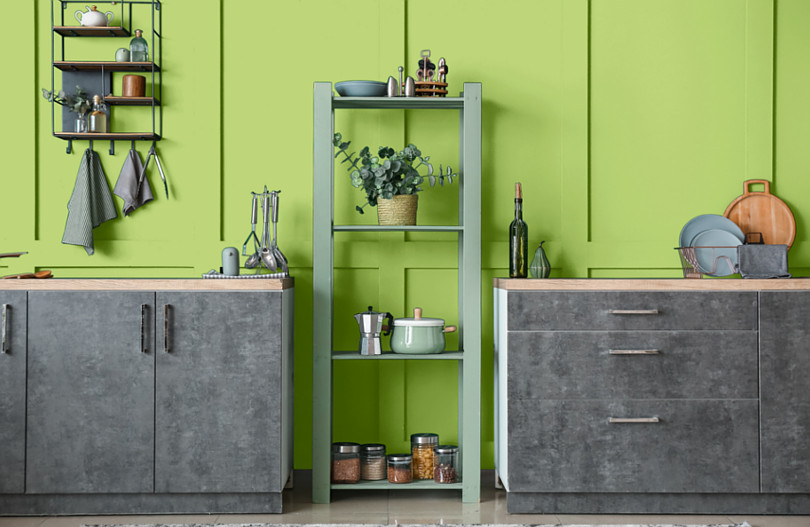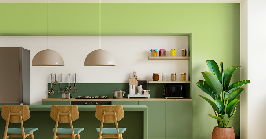 Zielony kolor w kuchni to znakomity pomysł. Pomaluj ścianę kuchenną farbą z kolekcji MAGNAT, pomyśl o zielonych frontach kuchennych, postaw na żywą zieleń w postaci roślin doniczkowych i ziół! Piękna, jasna kuchnia z zielenią w roli głównej na pewno skradnie Ci serce!