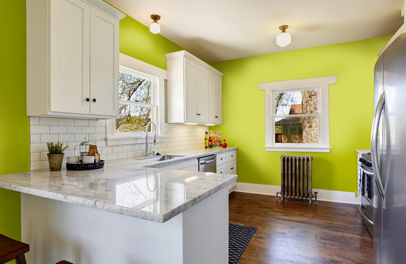 Optymistyczna kuchnia z zieloną zabudową i zieloną ścianą