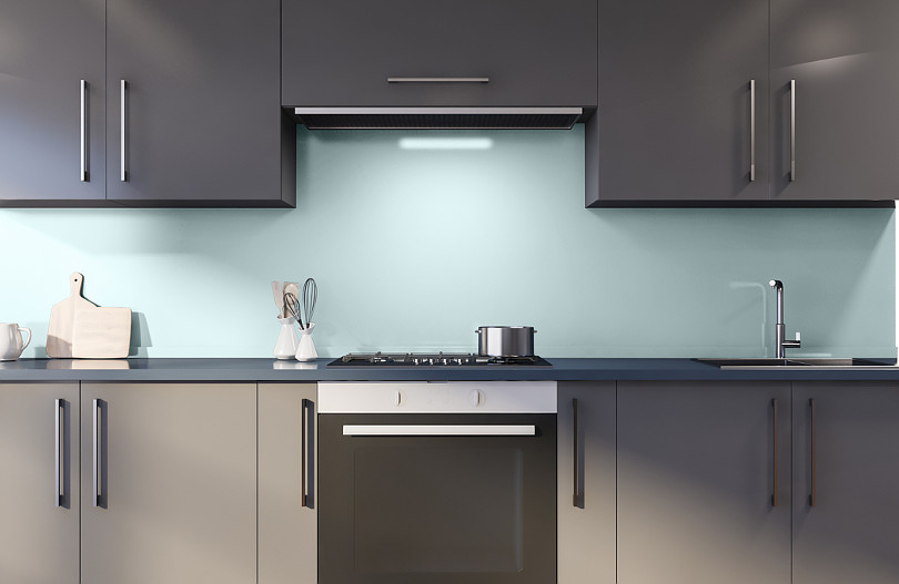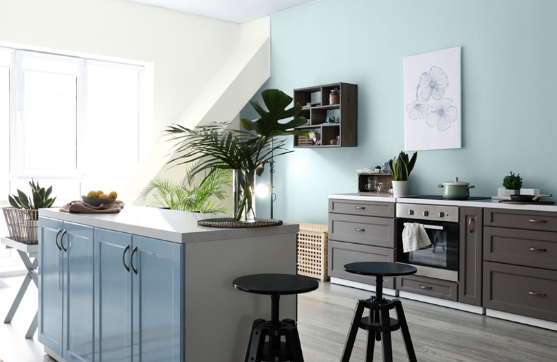 Jaki kolor ścian dobrano do tej szarej kuchni? To ciekawy odcień B17 morski akwamaryn z palety MAGNAT Ceramic Kitchen&Bathroom – niebieski, chłodny, ale przy tym pastelowy. MAGNAT Ceramic Kitchen&Bathroom to farba, która tworzy powłoki o hydrofobowych właściwościach. Dzięki temu doskonale nadaje się jako farba do kuchni – jest odporna na zabrudzenia płynne oraz tłuszcze.